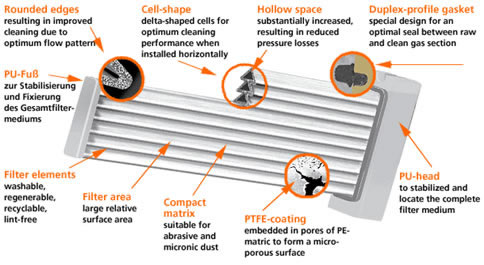 Both the material and the specially developed lamella, changed to the delta-shaped extended–surface pattern make the filter element very stable and rigid, combined with the possibility of an optimum cleaning of the horizontal elements, installed from the side.