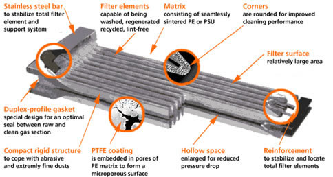 HSL filter element for surface filtration grant clean gas values of < 1 mg/m3, even with dusts of D50 < 1μm. The matrix consists of sintered polyethylene PE. An additional PTFE-coating gets into the pores of the PE-basic body and forms a micro-porous, non-sticking. This combined material is most extensively chemical resistant. The HERDING sinter plate filters are extremely stable in structure, rigid, water resistant and only need low-maintenance. The average useful life of HSL filter element can even exceed 10 years.